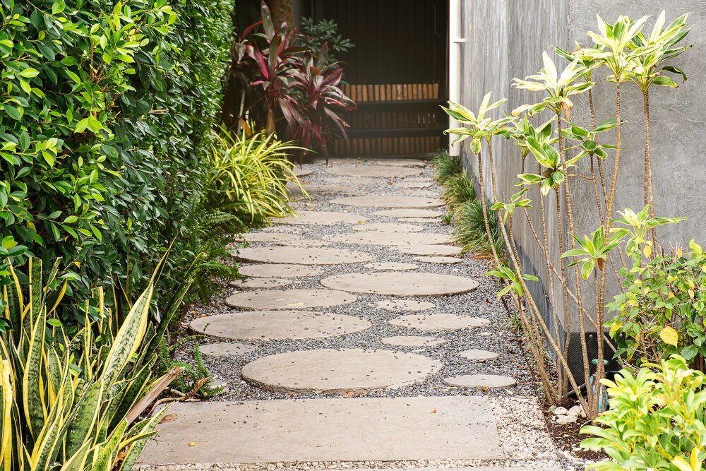 To jedno z najpraktyczniejszych rozwiązań dla osób, które nie chcą budować pełnej nawierzchni. Pojedyncze płyty (betonowe, kamienne, a czasem duże ceramiczne) układa się w rytmie kroków. W trawie wygląda lekko, w żwirze – nowocześnie i czysto. Dodatkowy plus: łatwiej ominąć drzewa, korzenie i istniejące rabaty.